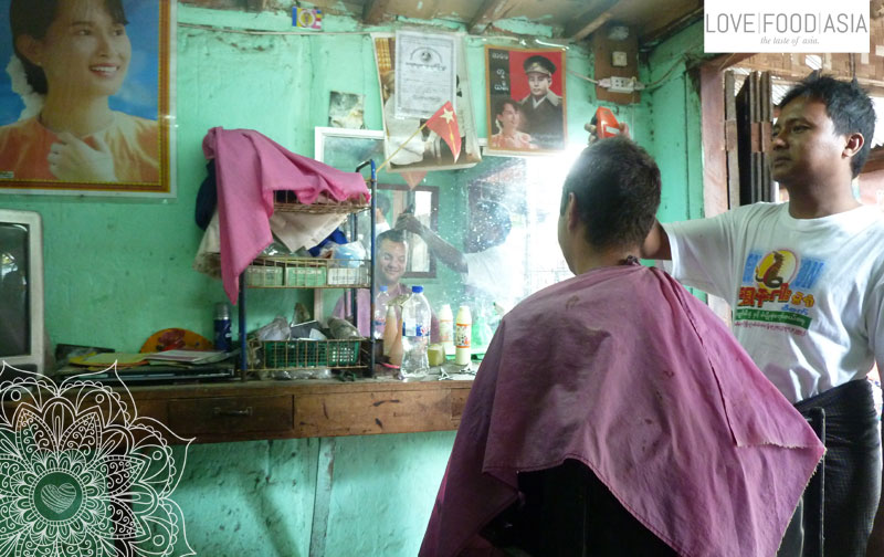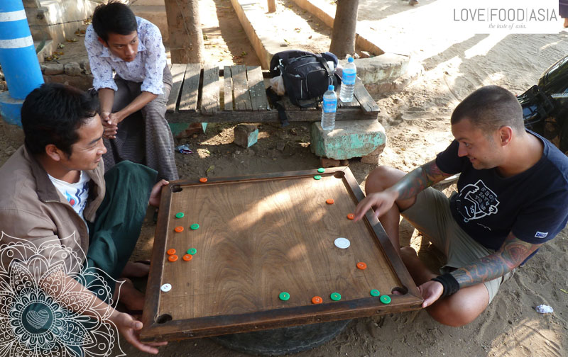 Wir verbrachten den Tag ganz ohne weitere Tempel zu besichtigen in Nyaung U auf dem Markt, im kleinen Garten unseres Hotels und bei dem kleinen Restaurant direkt neben unserem Hotel. Ich gönnte mir einen dringend nötigen Haarschnitt beim Herrenfriseur auf dem Markt für 500 Kyat (40 Cent) und wir spielten mit den Nachbarn des Hotels ein Brettspiel das mit den Fingern gespielt wird und nach einem ähnlichen Prinzip wie Pool Billard abläuft. Macht ganz schön süchtig das Ganze.