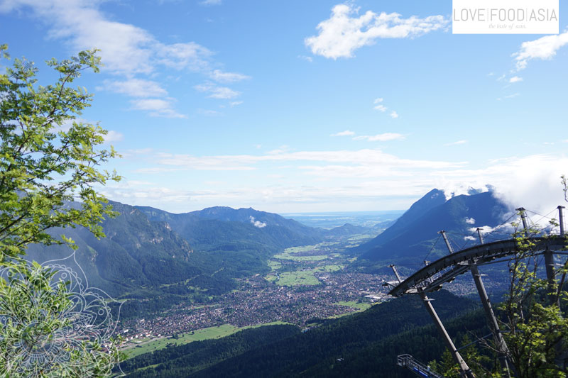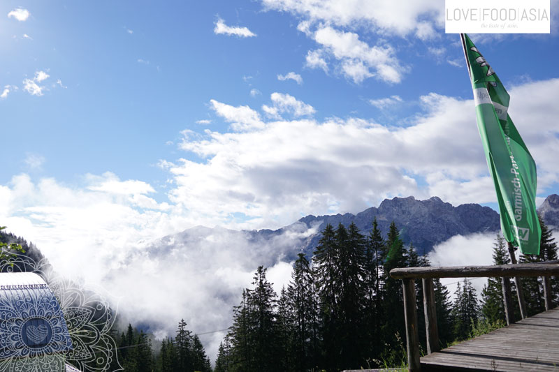 Die Beschilderung vor dem Kreuzeckhaus war eindeutig und so gingen wir, stets begleitet von der angenehm warmen Morgensonne, los in Richtung unseres Tagesziels. Der Weg führte Bergab und bereits nach wenigen Minuten war der eigentliche Weg wegen Bauarbeiten am Hang gesperrt. Wir folgten der beschilderten Umleitung. Diese führte uns wieder nach oben und schon bald hatten wir einen traumhaften Blick zurück auf das Kreuzeckhaus. In der anderen Richtung verbargen dichte Nebenschwaden den Blick auf die Zugspitze. Wir folgten der Beschilderung und kamen schließlich an der Hochalm heraus. Ab dort fanden wir keine Umleitungsschilder und wir folgten dem GPS-Track auf dem Handy. Nach einer starken Steigung und weitern 30 Minuten Gehzeit stellten wir fest das wir uns etwas verzettelt hatten. Es hieß also entweder umkehren oder unter einem Lift, welcher außer Betrieb war, nach unten steigen. Wir entschieden und für letzteres und liefen vorsichtig, teilweise auf dem Hintern, unter dem Lift hinab auf den eigentlichen Weg. Ein anstrengender Abstieg der aber den ein oder anderen Lacher wert war.