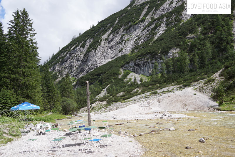 Mit minimaler Steigung ging es auf ganz einfachem Weg weiter. Unterwegs kamen uns einige Tageswanderer und Mountainbiker entgegen. Am Nachmittag erreichten wir die Reintalangerhütte, welche an einer wirklich schönen Stelle der Partnach gelegen ist. Zwischen Kiesbänken im Fluss standen Stühle und Bänke und die zwischen den Bäumen wehenden Gebetsfahnen ließen Erinnerungen an unsere Trekkingtour durch Nepal wach werden. Wir genossen erneut die späte Nachmittagssonne bei zwei Bier und einem stetigen Bachrauschen im Hintergrund. Der perfekte Ausklang eines doch etwas längeren zweiten Tages. Der Hüttenwirt setzt bei seinem Personal auf ein internationales Team und so wurde nach dem Abendessen (selbstverständlich ein Bergsteigeressen) international musiziert. Zwei Argentinier und ein Bayer ernteten eine Menge Applaus bevor es in die Schlaflager ging. Die Matratzenlager in der Hütte sind wirklich für schlanke Menschen eingerichtet. Wir hatten Glück und neben uns blieb ein Platz frei. So konnten wir die Nacht über mit etwas mehr Platz schlafen als die restlichen Wanderer im Lager.