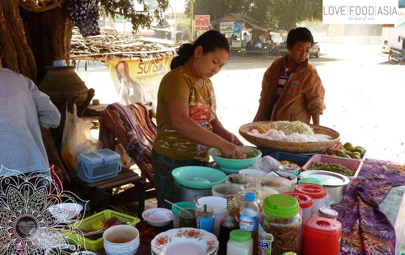 Mittags gab es im Schatten eine Portion Shan khauk-swe Nudeln. Ein typisch birmesisches Gericht welches an kleinen fahrenden Küchen zubereitet wird. Ein abgelegener Pfad führte uns zum Ufer des Irrawaddy wo wir im Schatten eines riesigen Baumes ein kleines Nickerchen machten.