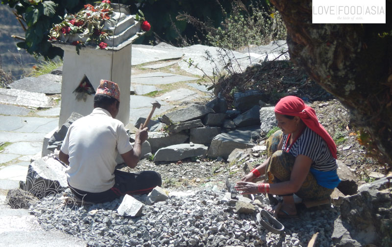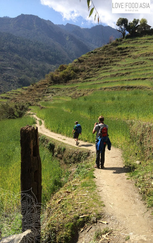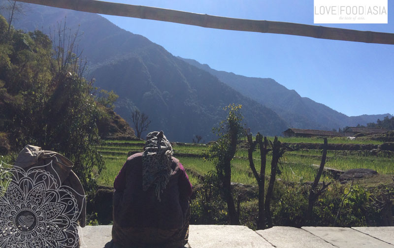 Heute war die Sonne nicht ganz so heiß und wir hatten das perfekte Wanderwetter. Wir liefen an einem Hang entlang bis wir an einer kleinen Häusergruppe eine Mittagspause einlegten. Dort gab es frische Brennesselsuppe was eine willkommene Abwechslung zum täglichen Dal Bhat war. Die Suppe war zudem super lecker.