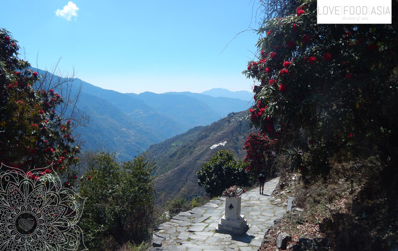 Auf dem letzten Abschnitt des Tages mussten wir ins Tal und überquerten eine Hängebrücke welche über einen kleinen Fluss gebaut war. Auf der anderen Seite ging es steil bergauf nach Tadapani. Meine Beine waren schwer aber die Rhododendron Bluten, zwitschernde Vögel und durch die Äste schwingende Affen machten den Aufstieg etwas leichter.