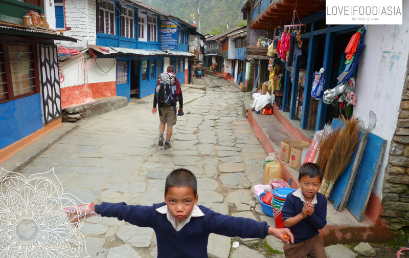 We went to the same place we had the Momos yesterday and ordered a Noodles & Egg dish and the delicious veggies soup. A very good base for trekking. In the restaurant we also met a little smart guy named Rosshan speaking a good English. We had a long conversation took pictures and changed our contact details.