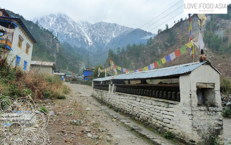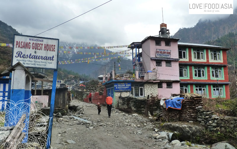 At 11 am the rain stopped and we started to walk much later than expected. We had a look back on Tal village and walk up the trail until we had to cross another suspensions bridge. Than we were back on the jeep road. The weather was still not good and when it started to rain again we made a late lunch break in a village called Dharapani. We decided to eat lunch in a oldest and most instable looking tin shack. And it was a good idea. We had homemade super delicious and also very cheap Samosas with an friendly family.