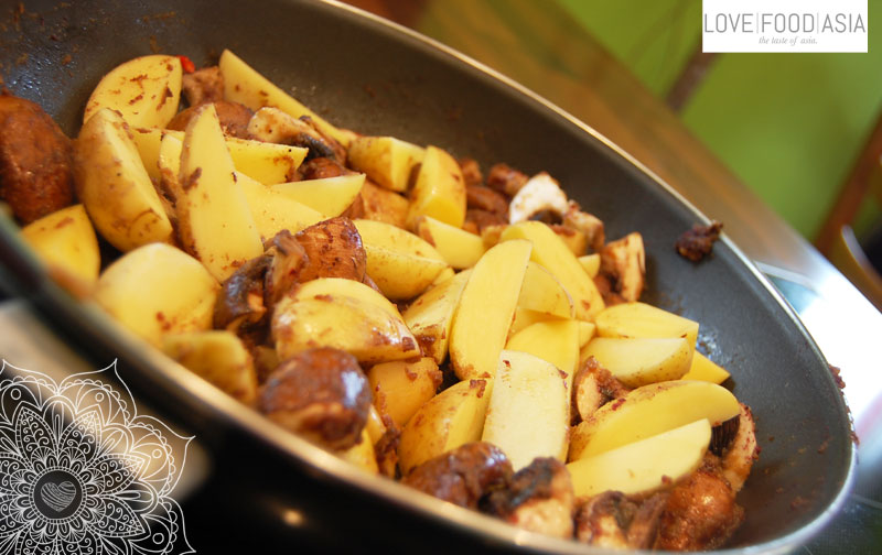 Put onion, garlic, ginger, soy sauce half of the peas and 2 tbs of water in a food processor. Mix until you have a smooth paste. Heat 1 tbs oil in a frying pan and add paste. Fry for 5 minutes. Add mushrooms and chilies and stir fry for 3 minutes. Stir in curry powder until all mushrooms are covered. Add potatoes and stir fry for 2 minutes.