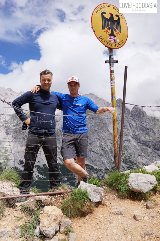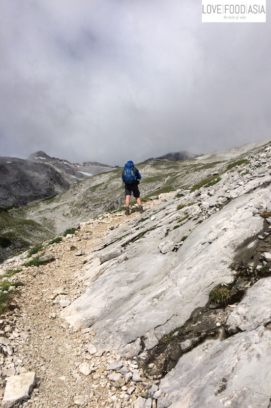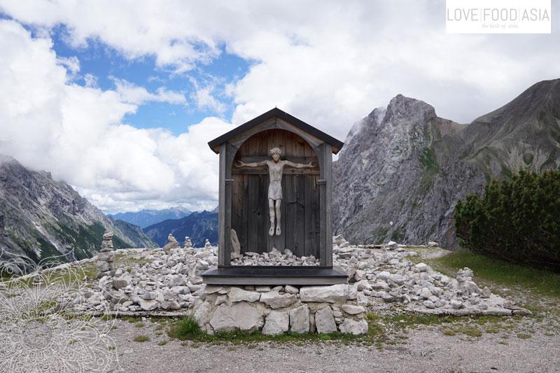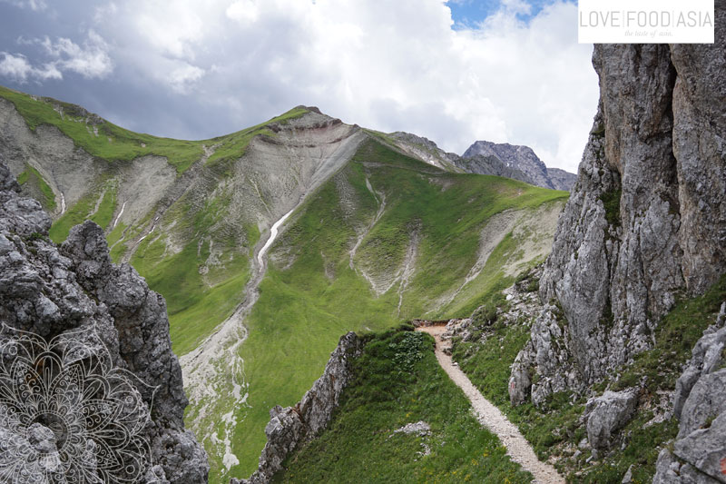 After two hours we reached the Knorrhütte which is also a part of the Zugspitz-Tour. One more time we couldn´t see the highest mountain of Germany becaus the peak was covered by fog. We had a vegetable soup and a 30 minutes nap at the lodge. Now we could feel that we haven´t had enough sleep the last night. But we had to walk on. Our destination was another 3 hours walk away from here. So we got up from our short nap and followed the trail to the German – Austrian border. This place at the border is called “Gatterl” (2.024 m). At the Gatterl is a metal gate and I have no idea why. We crossed the border and climbed down at a small path until we reached the Feldern Jöchl (2.041 m) and 15 minutes later the Wannigjöchl (2.168 m).