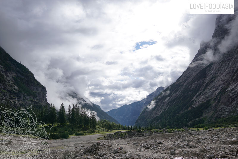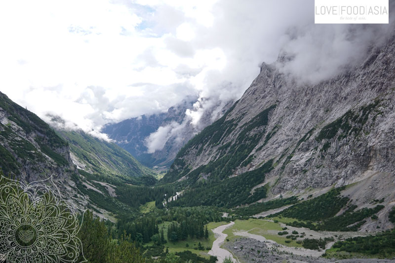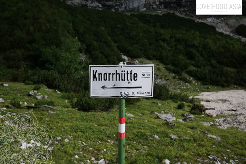 We had a hard night in our dorm. At least two guys where snoring hardly and if you wake up once it is hard to fall asleep again. Even when you wear some earplugs. We forced our tired bones to get up and after a refreshing stay in the bathroom we paid our beds and started to walk. We still had some fruits and muesli bars so we started without breakfast agein. The first part was from the Reintalangerhütte to the Knorrhütte. We walked to the end of the Partnach and we could see a lofy rock wall in front of us. It seemed like there is noch path up to the next lodge. But when we came closer we could see a small trail. It was a hard climb and our hearts where bumping. The perfect morning sports and the perfect thing to forget about the sleepless night. When we reached the top of the rock wall at the end of the Partnach valley the morning sun was shining and we had a great view back at the Partnach and the Reintalangerhütte.
