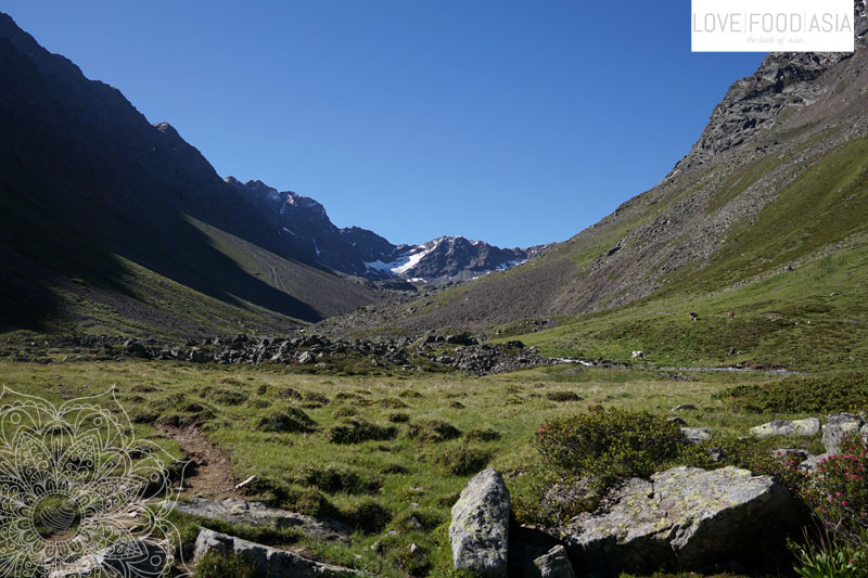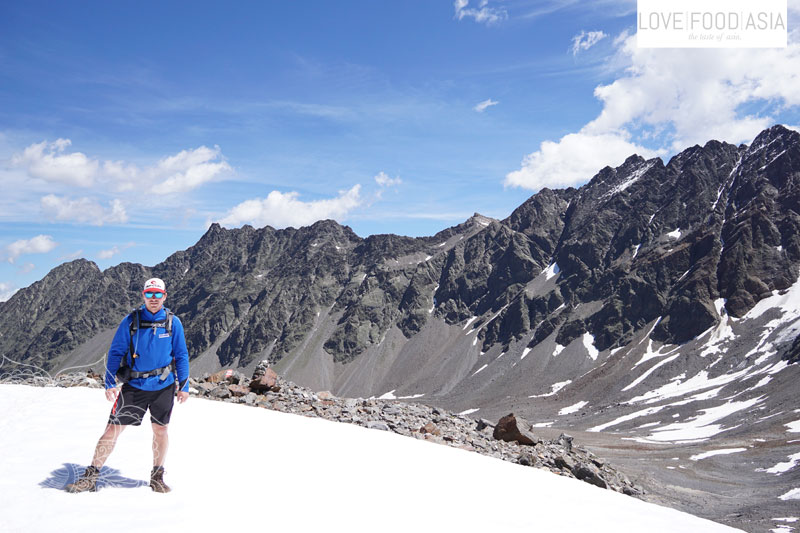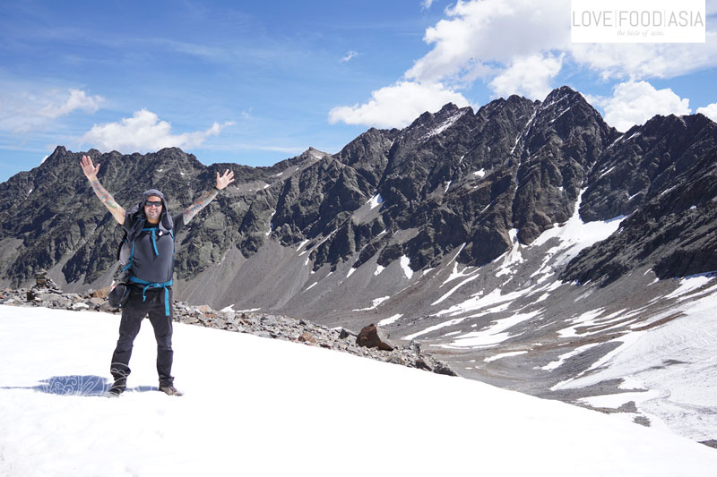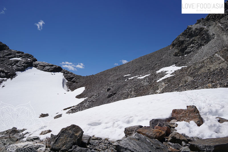We where now surrounded by mountains and also the sound of the mountain creek has turned into silence. A silence you don´t have that much back home. That´s one of the reasons why we come to travel and hike in the mountains. After two hours of walking time we had to cross the first snow fields and it seemed that we where really close tot he Zwieselsbachferner. The glacier looked very impressive and the bright sun made the snow work like a reflector. Like in the Annapurna region we where wearing our sunglasses constantly. The snow was a bit slippery on top but passing the snow fields wasn´t a big thing in the end.