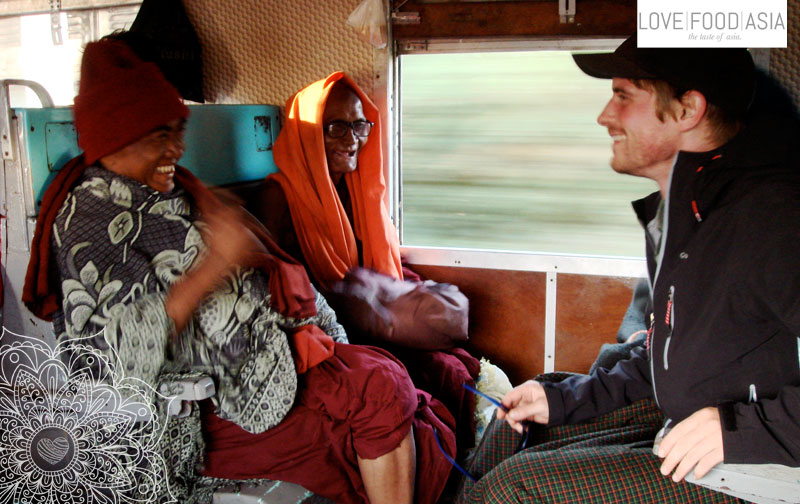 Next to the locals we enjoyed the scenery on the outside and the conversations on the inside of the train. Everyone in our compartment tried to have a chat with us and the people shared their food with us. Everyone was so friendly. Next to us two old monks took a seat. Both between 60 and 70 and these guys where so funny. We had so much fun. Matthias once used his deodorant spray and they haven´t seen one before. So one of the monks asked him if he could try it as well. He was laughing out lound and screamed such because of the cold spray. Everyone in the compartment was laughing.