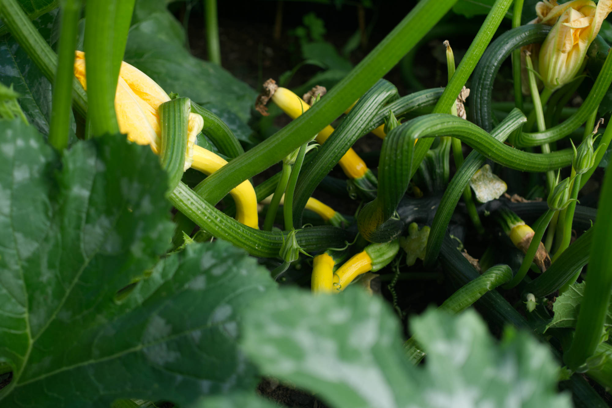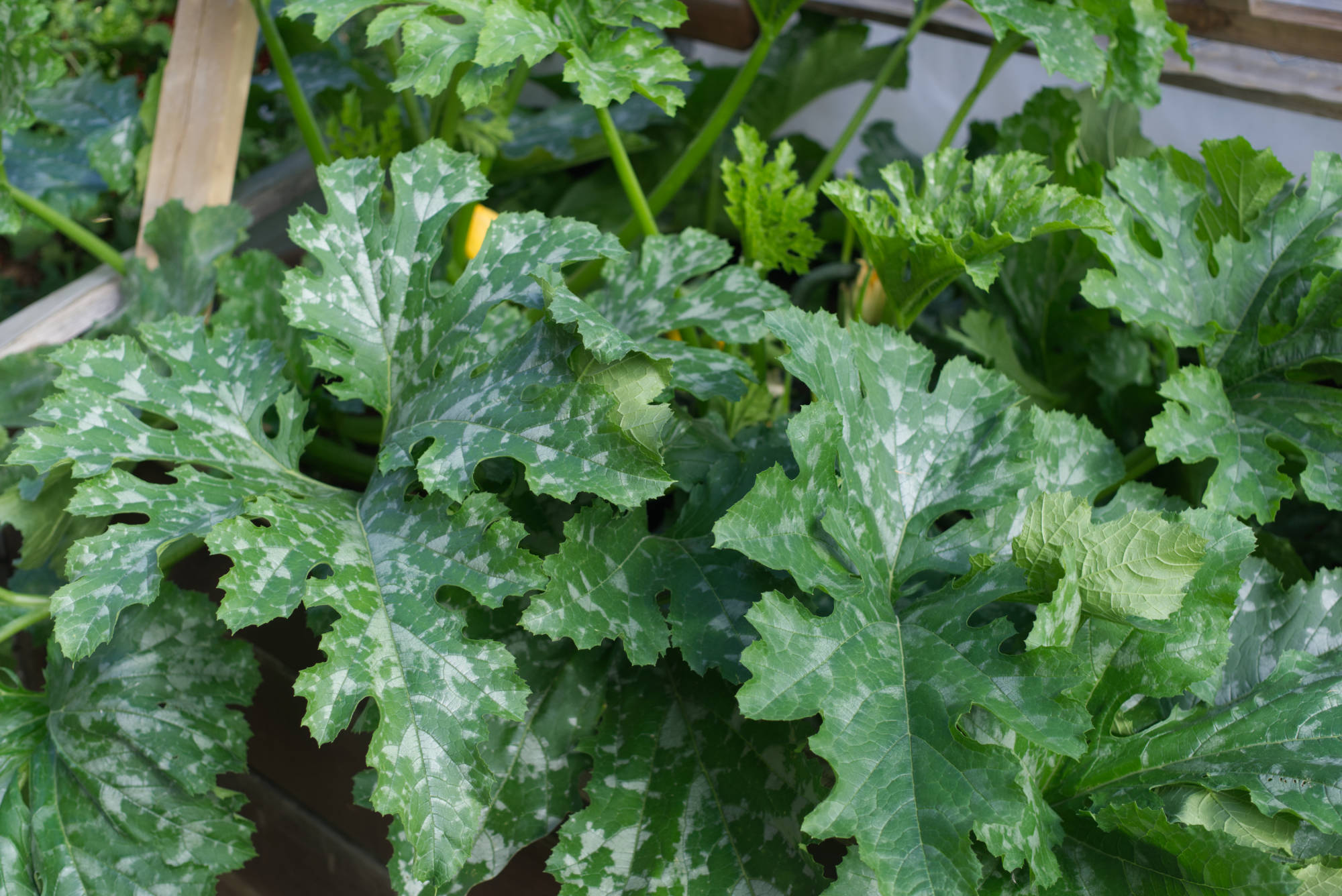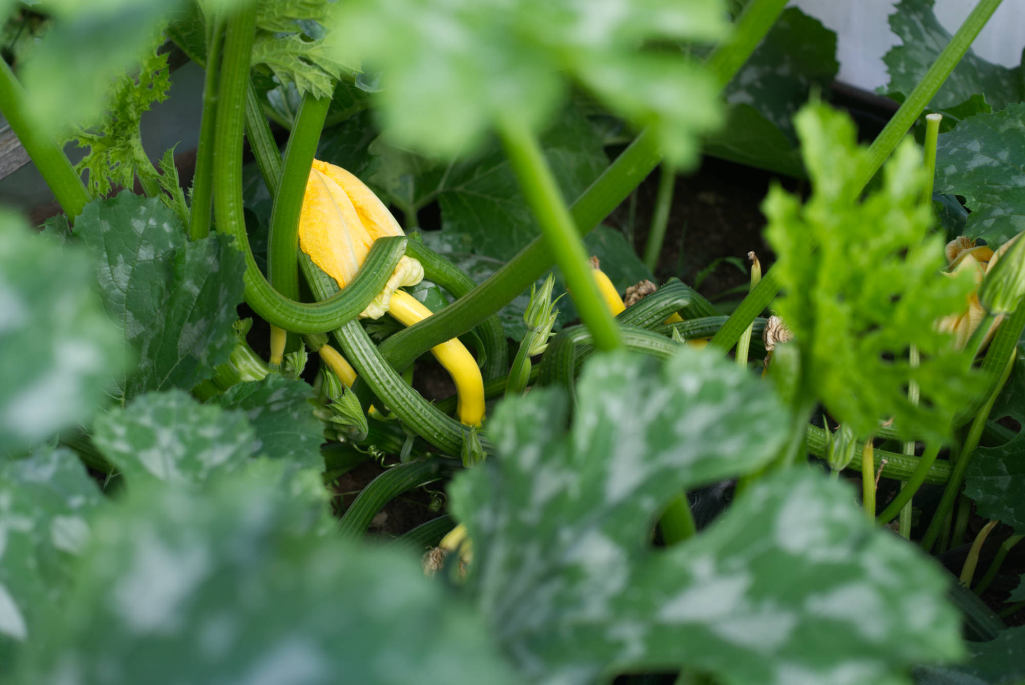 Here you can see two of our gigantic zucchini plants. We grow them in a raised bed and a simple mortar bucket.